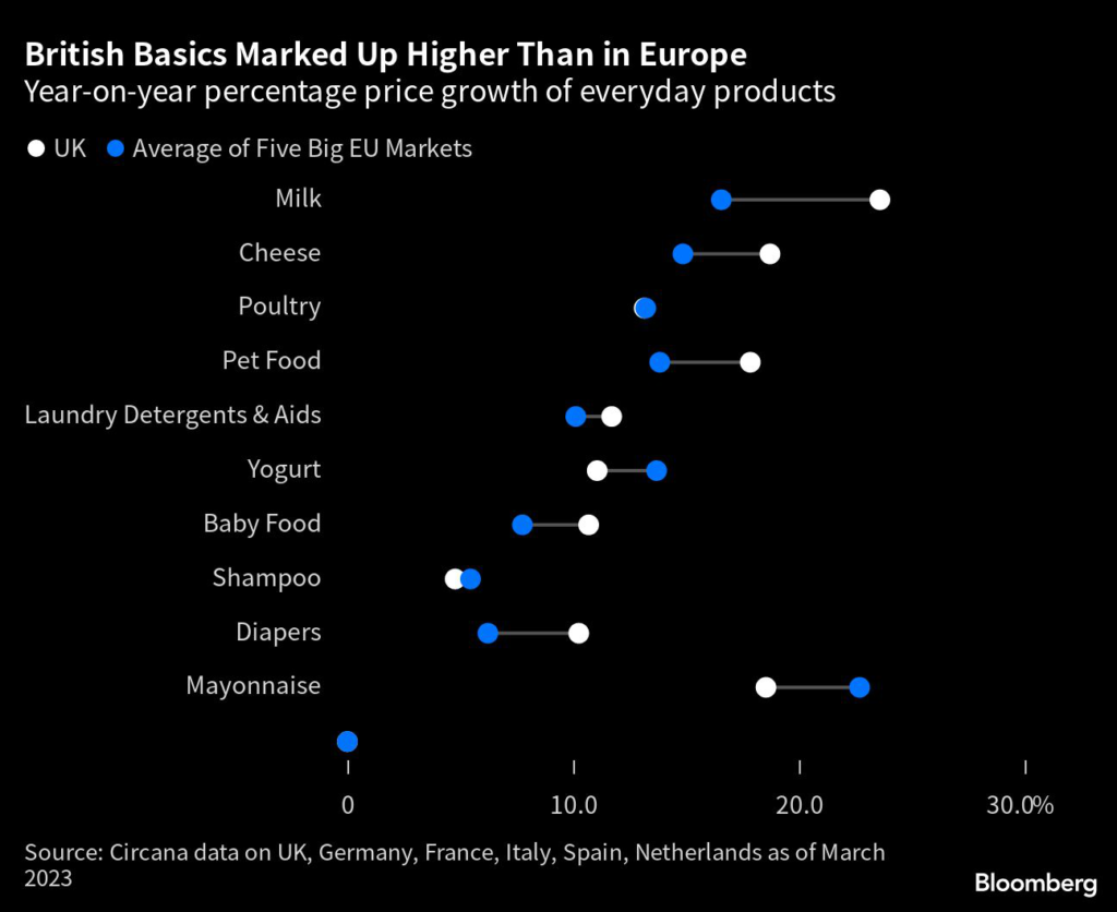 (Bloomberg) — Britons are paying more for their everyday products like milk and baby food than other Europeans, as inflation chips away at household budgets.