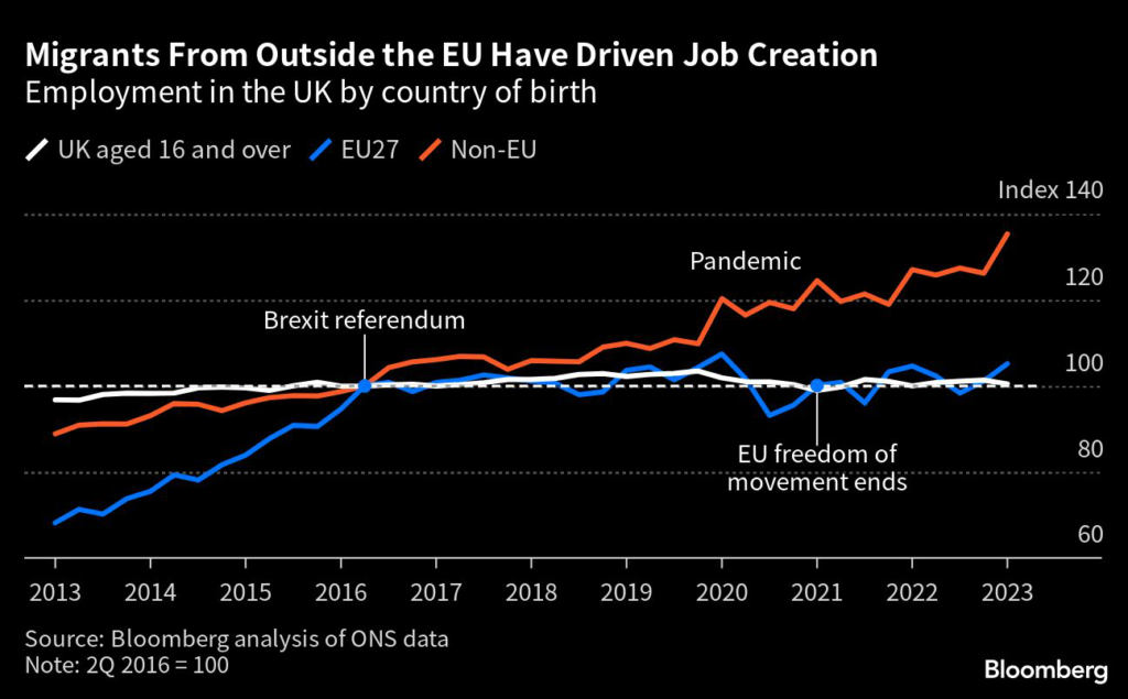 That’s a political problem for Prime Minister Rishi Sunak, who is under pressure to deliver on a long-standing Tory promise to bring down the number of foreigners arriving in the UK each year — a central argument for Britain’s exit from the European Union.