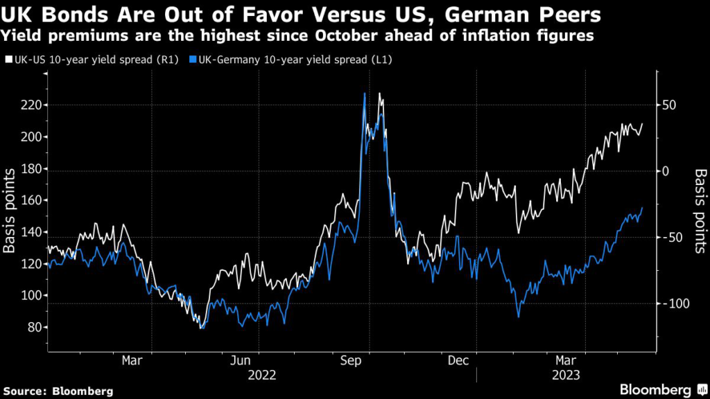 Optimism over the US debt ceiling and banking industry damped demand for the UK’s safest assets last week. Investors offloaded 10-year bonds at the fastest pace in a month, lifting the yield above 4% and raising the premium versus US and German counterparts to the highest since October.