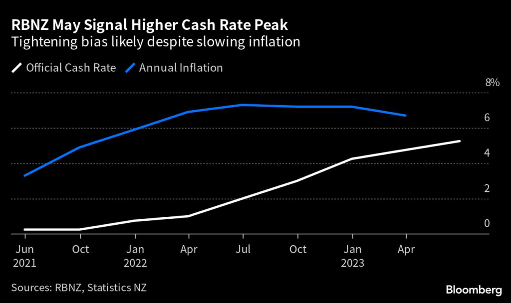 New Zealand’s central bank is poised to raise interest rates for a 12th straight meeting and may signal it’s not done yet as surging immigration and looser fiscal policy counter its efforts to curb demand.