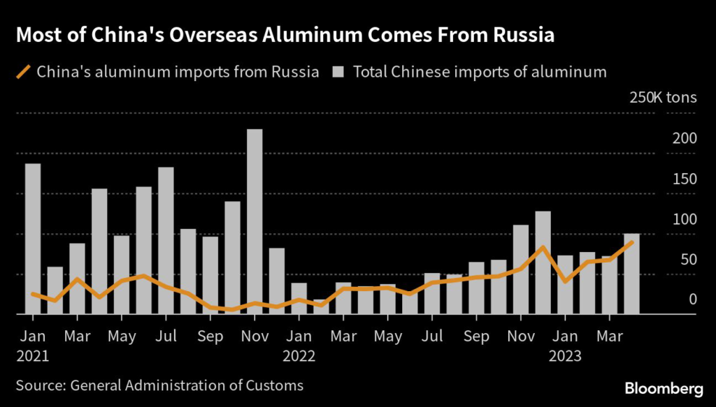China, the biggest producer of aluminum globally, is importing more of the lightweight metal from Russia, underscoring how trade ties are strengthening between the two nations as sanctions curb much of the rest of the world’s appetite for Russian commodities.