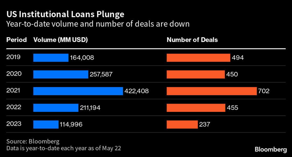Leveraged loan issuance, excluding refinancings, has plunged to $18.5 billion this year as of early May, an 82% drop compared to the same period last year, according to research by JPMorgan Chase & Co.