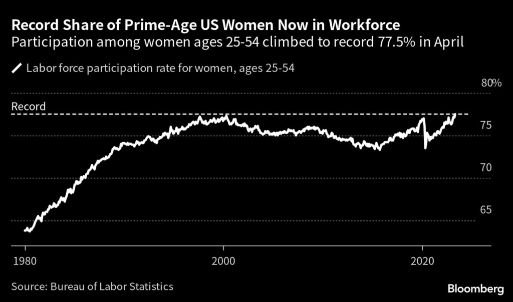 The participation rate for that group climbed to a record high of 77.5% in April, surpassing a peak reached in 2000, according to government data going back to the 1940s.