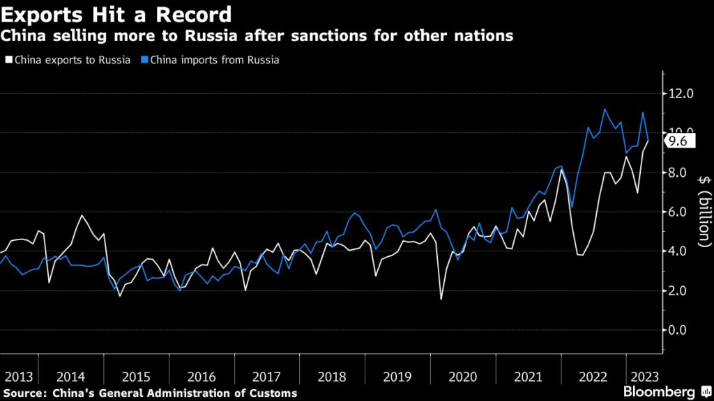 China’s exports to Russia hit a record in April, jumping 153% from a year earlier to $9.6 billion.