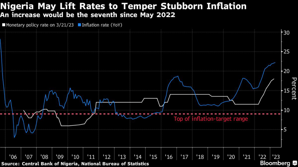 The Central Bank of Nigeria is expected to raise interest rates for a seventh consecutive meeting on Wednesday, seeking to curb stubbornly high inflation that will likely stay elevated due to the planned scrapping of a costly fuel subsidy.