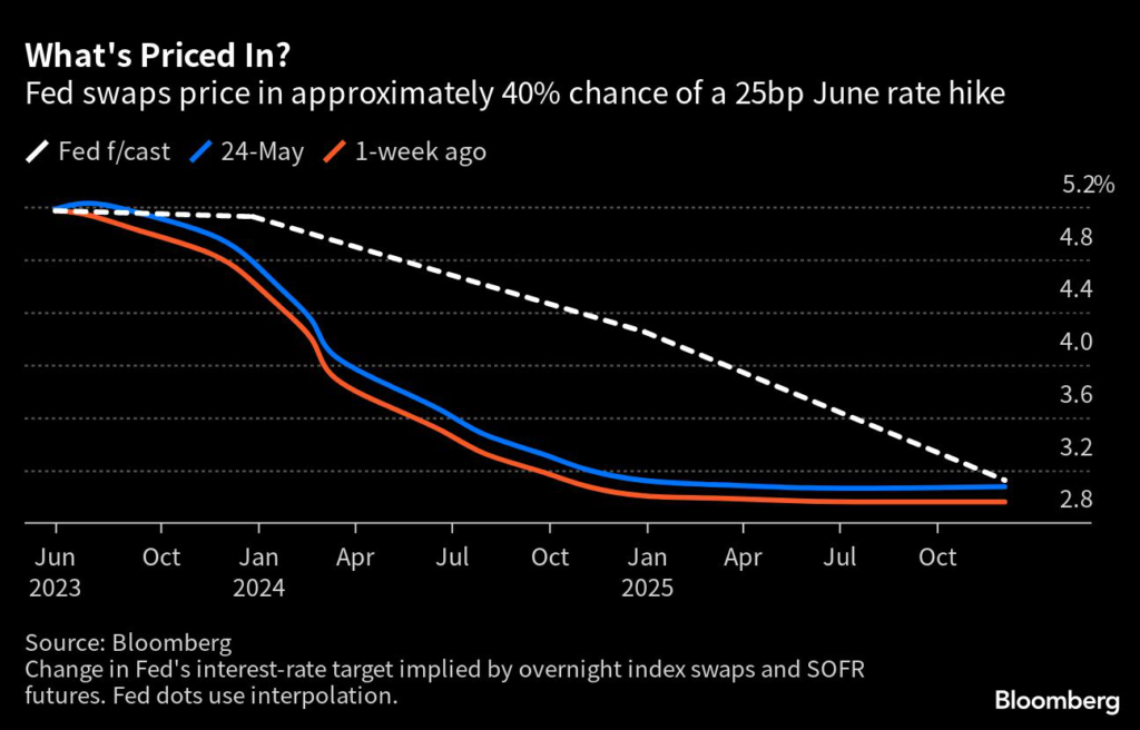 Swap contracts temporarily priced in as much as 12 basis points of tightening in June, a new high since the last central bank hike on May 3, despite the persistent threat that lawmakers will fail to raise the US debt ceiling in time to avoid a financial crisis.