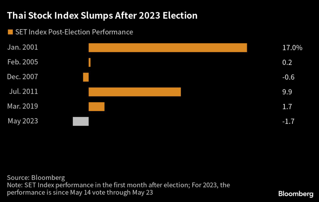 Uncertainty after the May 14 election first triggered an outflow of funds, worsening the rout in Asia’s worst-performing stock market this year and weakening the baht.