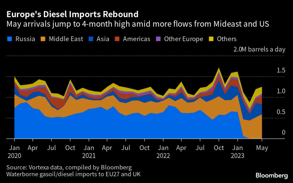 (Bloomberg) — The European Union is managing to replace shipments of diesel from Russia — by far the bloc’s top external supplier before a ban on seaborne imports started in February.