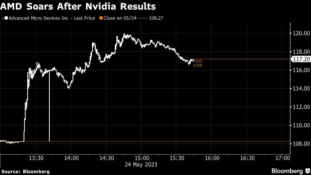 Rival chipmaker Advanced Micro Devices Inc. jumped 11%, while suppliers from Taiwan Semiconductor Manufacturing Co. to Advantest Corp. also climbed. Along with memory chipmaker SK Hynix Inc. and Europe’s ASML Holding NV, ASM International NV, BE Semiconductor Industries NV, VAT Group AG and Soitec, they collectively added $215 billion of value in a market otherwise preoccupied with concerns about the US debt limit and China’s economic slowdown.