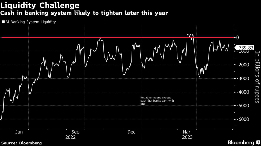 Excess liquidity in the banking system has narrowed to about 834 billion rupees from this year’s high of about 3 trillion rupees in April, according to data compiled by Bloomberg Economics.