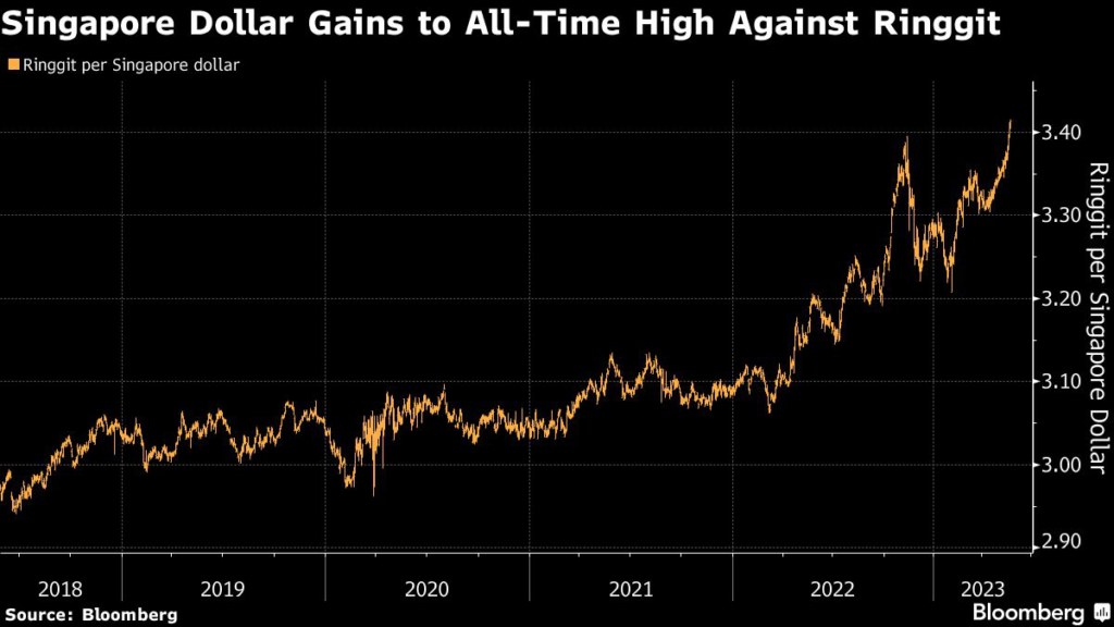 (Bloomberg) — The Singaporean dollar surged to the strongest level on record against the Malaysian ringgit, with the latter suffering more from weakening confidence in China’s economic recovery.