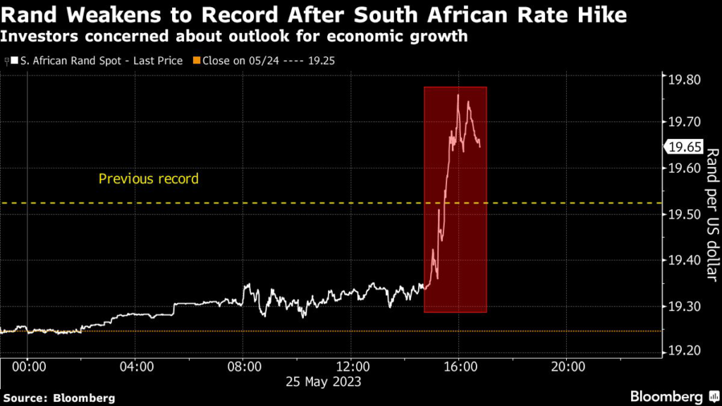 (Bloomberg) — South Africa’s rand plunged to a record low as another jumbo rate hike by the country’s central bank raised concerns about the outlook for economic growth.