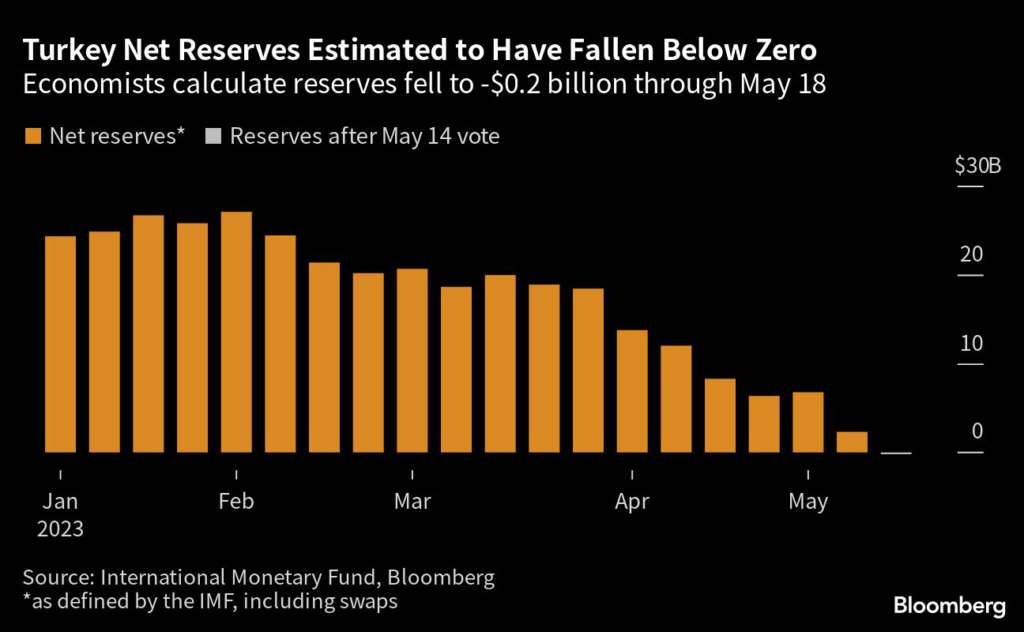 The central bank has additionally been ramping up interventions in the currency market, an approach so costly that it helped push net reserves — as defined by the International Monetary Fund — slightly below zero in the week after the first round of elections on May 14.