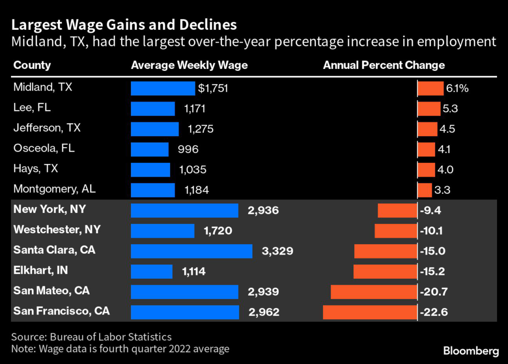One bright spot was Midland, Texas, which saw average weekly wages rise 6.1%, the biggest increase among the 355 largest counties.
