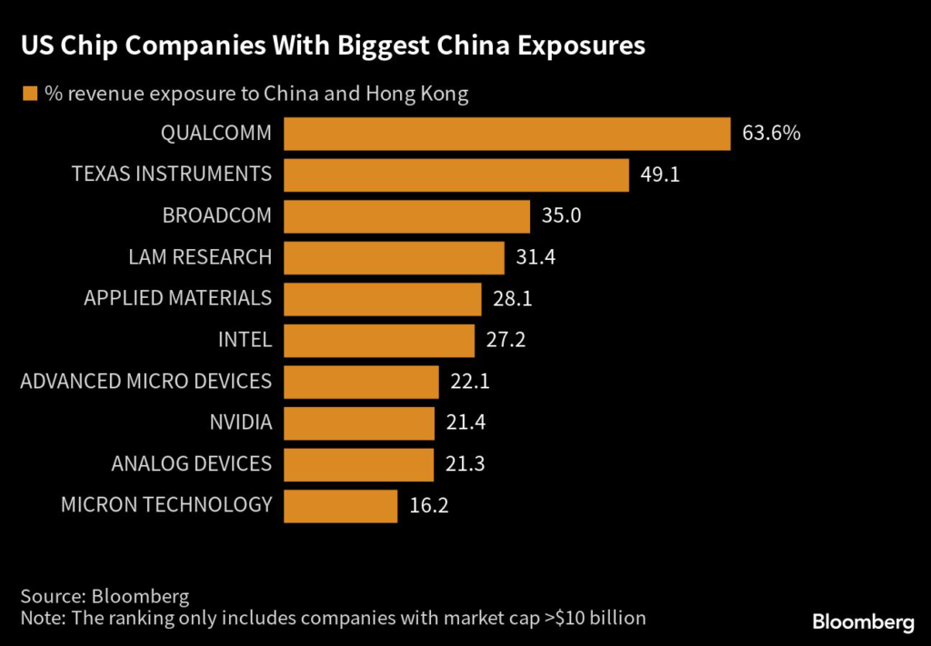 CPU manufacturer Intel generated 27% of its revenue from China and Hong Kong, while the China exposure of GPU maker Qualcomm and Nvidia is 64% and 21%, respectively.