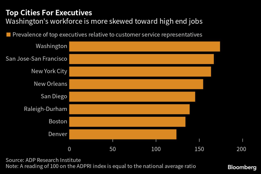 The study analyzed the ratio of C-suite executives to customer service representatives and found that it has shifted sharply — with the former group increasingly clustered in expensive cities, while the latter gathered in more affordable ones.