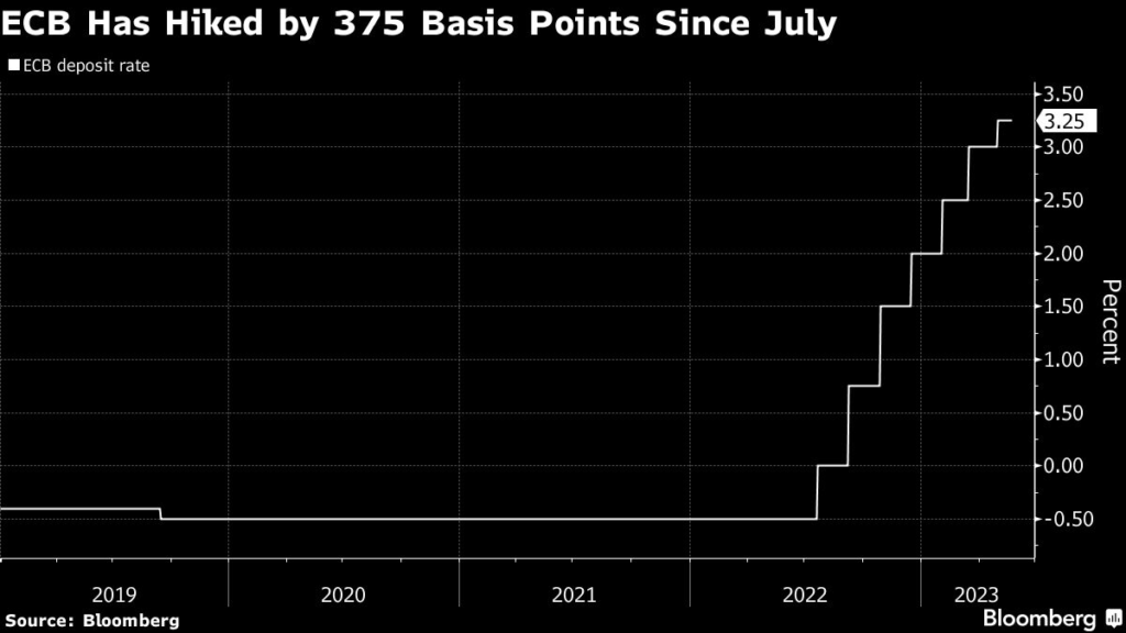 The ECB this month shifted to a slower pace in raising borrowing costs, hiking 25 basis points. That’s the smallest move in this cycle of 375 basis points of tightening, which kicked off in July and is likely to see at least two more steps of that size in June and July.
