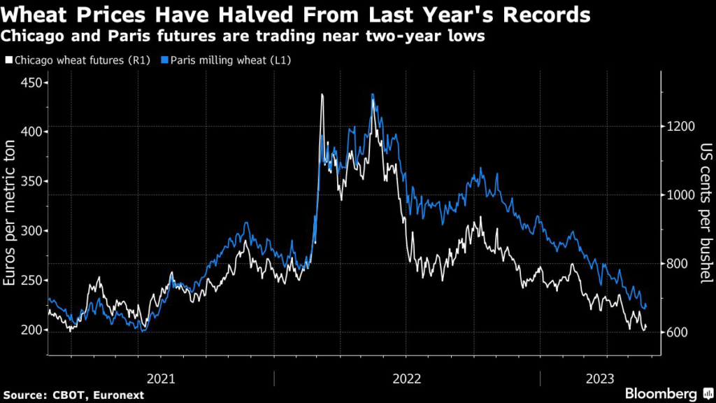 The strong outlook for the world’s top wheat shippers has helped prices fall to less than half of last year’s record highs, buffering the impact of drought in other growing regions and the shortfall wrought by the war in Ukraine.