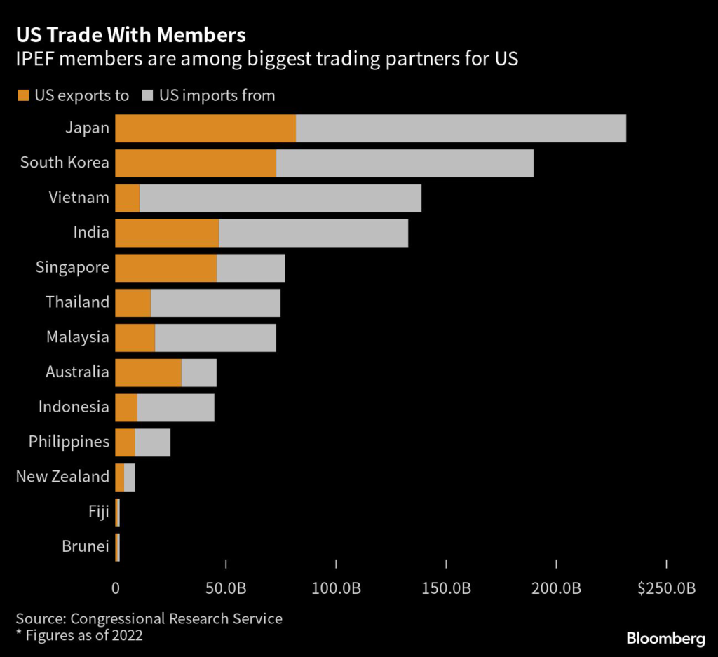 The US began the initiative, known as IPEF, as a way to counter China’s growing influence and make up for lost ground after pulling out of previous efforts to set regional trade rules.