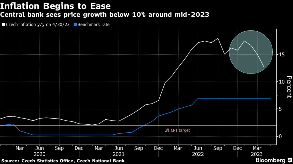 Czech inflation is slowing from the highest levels in about three decades, with the annual rate dropping to 12.7% in April from 15% the previous month.