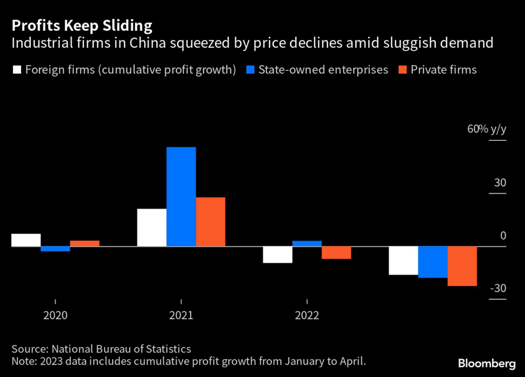 (Bloomberg) — Profits at industrial firms in China kept falling in the first four months of the year, underlining cooling demand and deepening factory-gate deflation in the world’s second-largest economy.