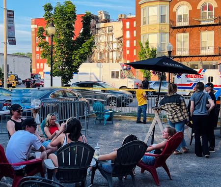 A center section of the six-story building with 84 apartments and business collapsed for unknown reasons on Sunday afternoon, prompting an immediate rescue effort that pulled seven people from multiple floors of the building, some by firetruck ladder.