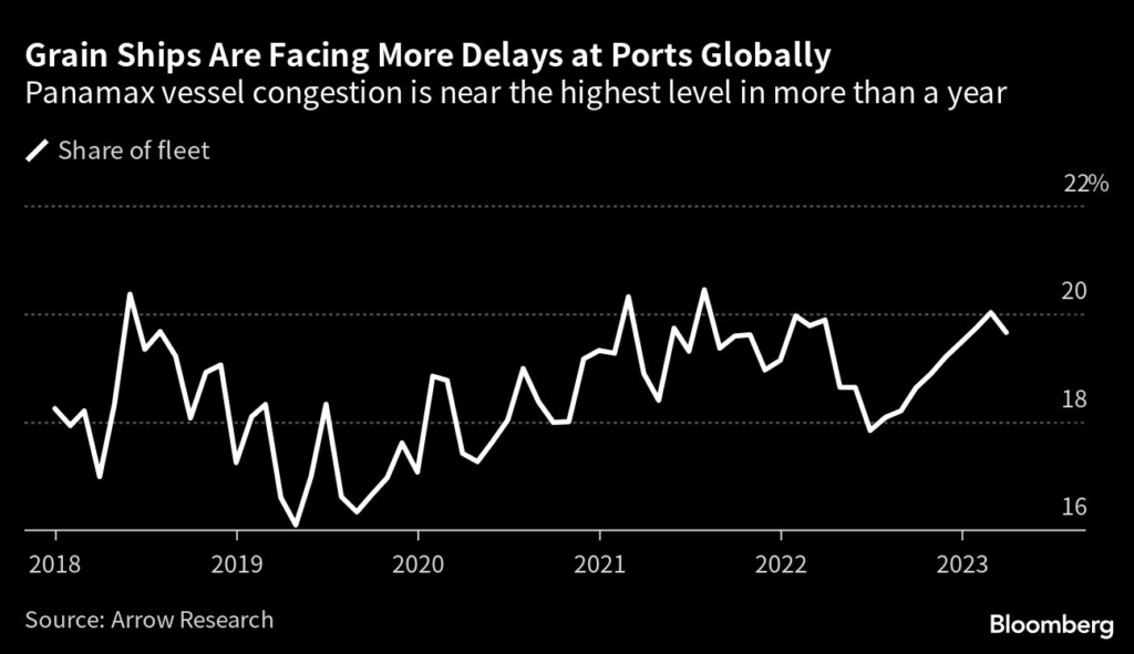 Ships are waiting longer at countries like Turkey and China, which have raised their imports of food and fuel this year. Congestion levels in March surged to 20% of the total Panamax fleet, the highest since August 2021, according to Arrow Shipbroking Group.