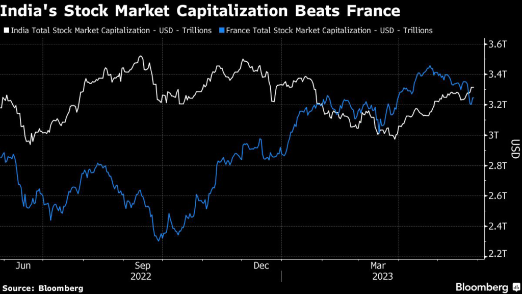 India’s market capitalization stood at $3.3 trillion as of Friday, helped also by a rebound in Adani Group’s stocks after a short seller report earlier in the year sparked a heavy selloff.