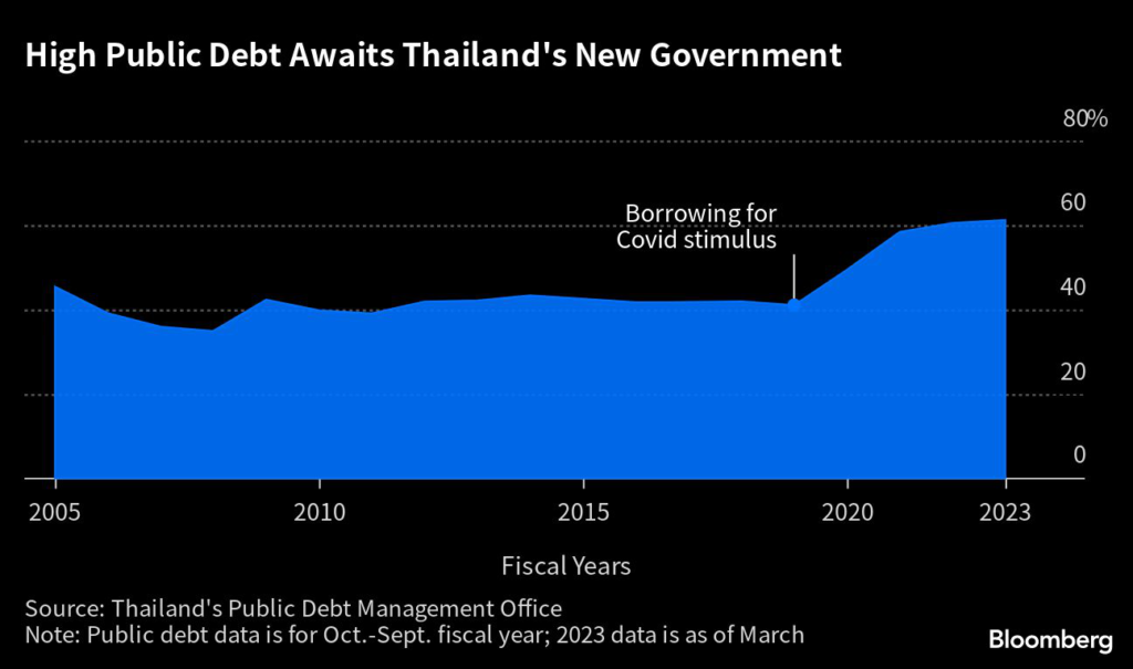 Thailand’s public debt has risen to more than 60% from about 40% before the pandemic after the nation ramped up borrowing to tackle Covid outbreak and fund stimulus measures.