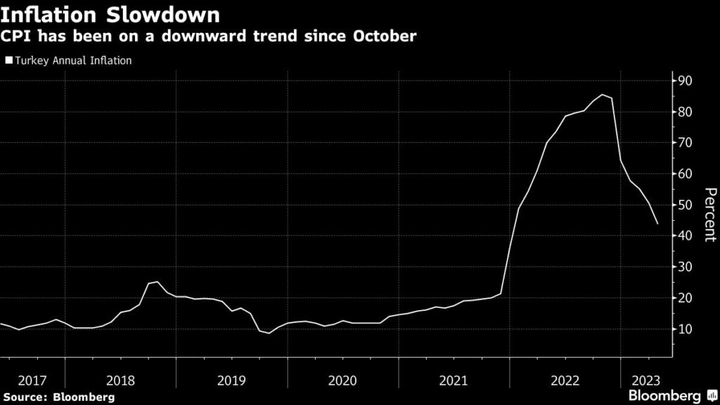 (Bloomberg) — Turkey may post its first month-on-month negative inflation in more than four years, giving newly reelected President Recep Tayyip Erdogan an early boost as he seeks to shore up confidence in the economy.
