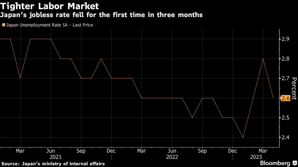 (Bloomberg) — Japan’s unemployment rate fell for the first time in three months, potentially feeding into higher wages and providing support for the Bank of Japan’s sustainable inflation goal down the line.