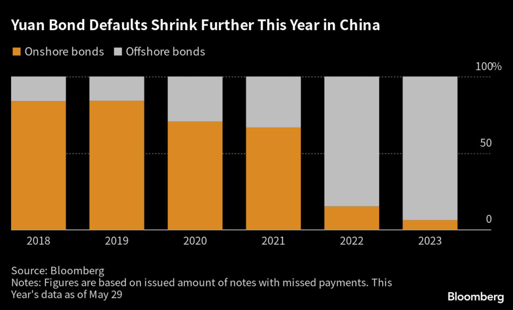 All but 6% of public bond defaults by the country’s firms have been on offshore notes by issuance amount, a record according to data compiled by Bloomberg.