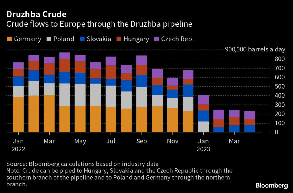 Flows of Russian crude through the Druzhba pipeline, now limited to deliveries to Hungary, Slovakia and the Czech Republic, have been stable at about 240,000 barrels a day since February.
