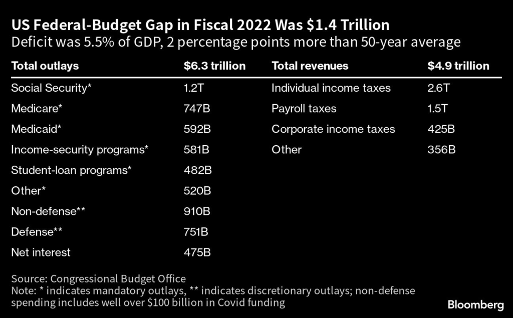 The deal doesn’t touch most of the fast-growing entitlement programs like Medicare, Social Security or Medicaid, which represent the bulk of the budget — as seen in the chart below showing the breakdown for fiscal year 2022.