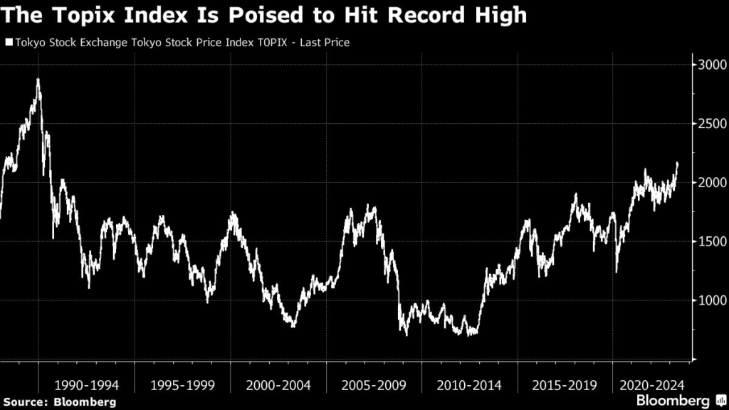 (Bloomberg) — The start of an inflationary regime, coupled with the Tokyo Stock Exchange’s valuation reforms, will boost Japanese stocks to their record high as early as the first half of 2025, according to BofA Securities.