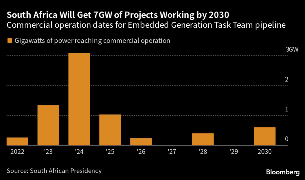 (Bloomberg) — South Africa expects private companies to add more than 4 gigawatts of electricity generation capacity to the grid by the end of 2024, as the government accelerates efforts to increase private sector participation in its power, rail and water industries.