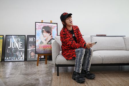And his persona’s catchy manner of speaking, wolf-cut hairstyle, retro outfits and mastery of old Japanese and K-pop songs have contributed to that success.