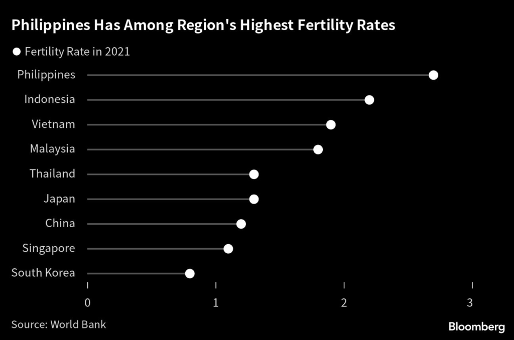 There are some signs of progress. The Philippines’ fertility rate fell to 1.9 children per woman in 2022, according to preliminary government data, though it’s hard to gauge the impact of pandemic-related restrictions.