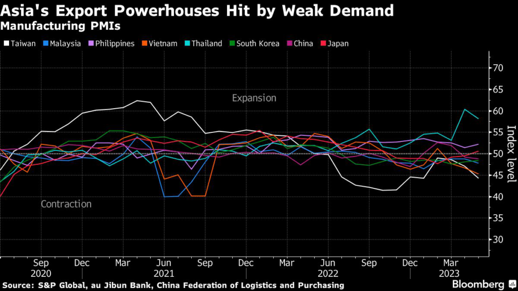 (Bloomberg) — Asia’s factories saw further easing in demand in May as China’s faltering recovery weighed on a region already smarting from a global trade downturn.