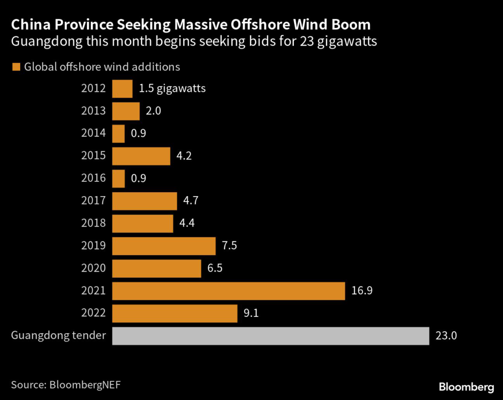 China’s Guangdong province will accept bids this month to construct 23 gigawatts of offshore wind power as one of the nation’s economic engines seeks to stave off energy shortages.