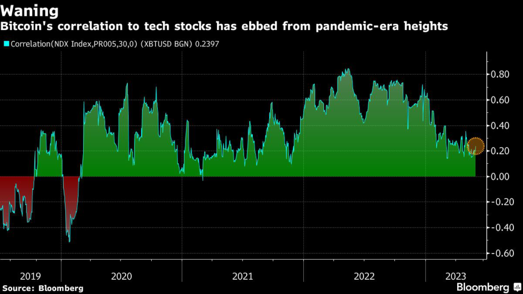 A 30-day correlation coefficient for Bitcoin and the tech-heavy Nasdaq 100 is around 0.2 versus 0.8 in May 2022.