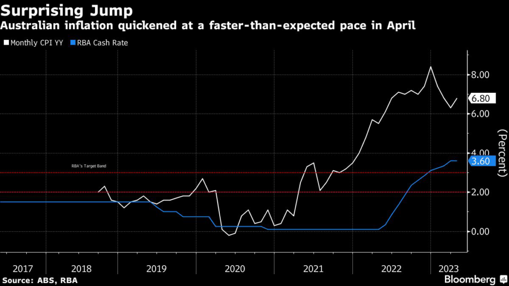 Inflation accelerated faster than expected in April, Sydney house prices jumped the most since 2021 in May, while Bloomberg Economics estimates Australian firms are set to unleash record spending in 2023-24.