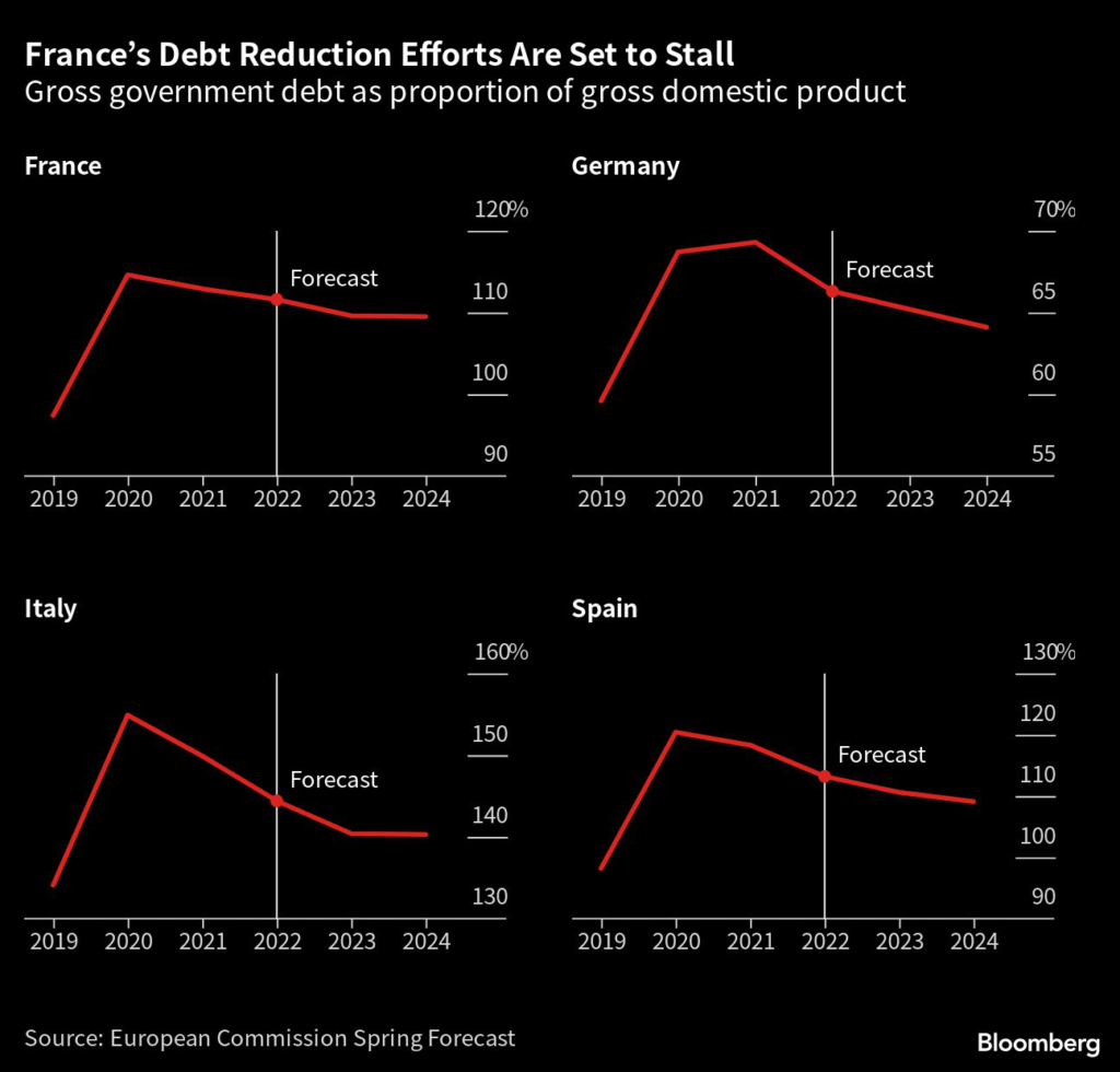 Macron is also continuing to pledge more investment in the climate transition, defense and a reboot of ailing industry, even while officials forecast the annual cost of servicing France’s debt to increase more than 50% to €70 billion by 2027.