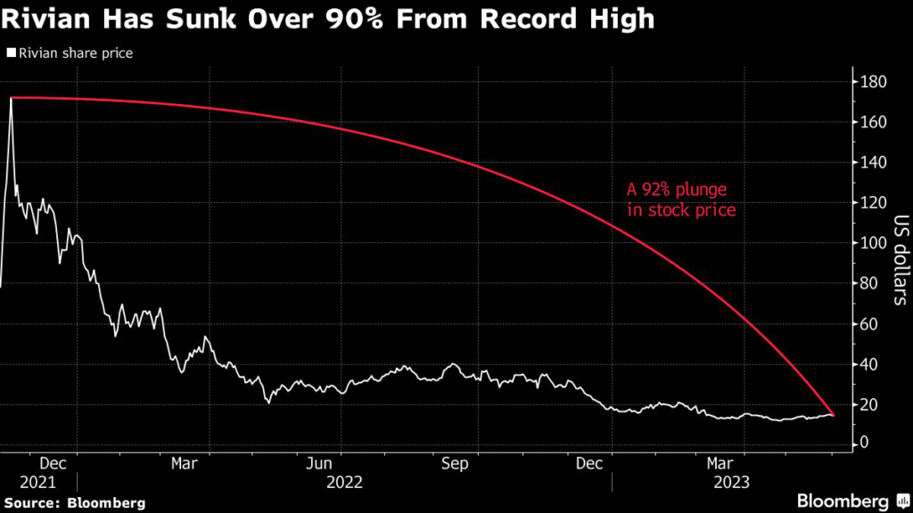 Rivian shares fell as much as 4.8% to $14.02 on Thursday in New York, but later pared most of the losses to trade down 0.1% by 1:54 p.m.
