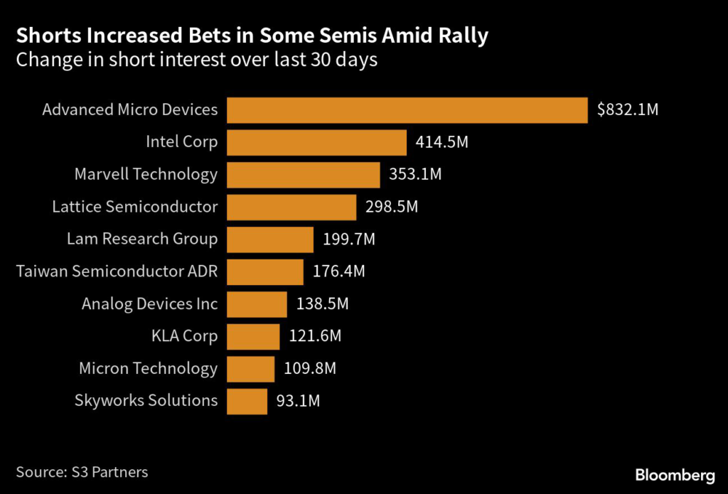 In the last 30 days, traders have added nearly $1.4 billion in bets against the sector, with the largest increases in short selling in Advanced Micro Devices Inc., Intel Corp., Marvell Technology, Inc.