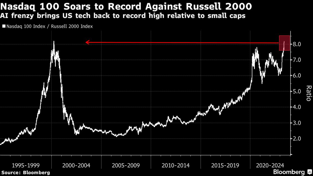 “Monopolistic tech” is winning through pricing power and the squeeze on smaller suppliers, Hartnett wrote in a note, highlighting the Nasdaq 100 Index is now at a record high relative to the Russell 2000 small-cap index.