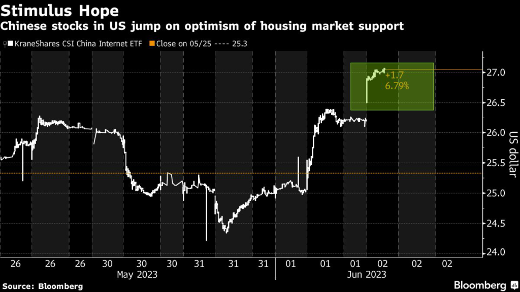 (Bloomberg) — US-listed Chinese stocks jumped in premarket trading after Bloomberg News reported that regulators are considering new measures to aid the property market, buoying hopes that Beijing may roll out policy stimulus to reinvigorate a faltering economic recovery.