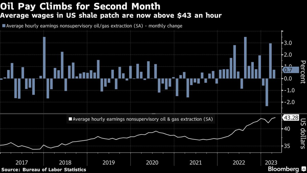 Wages for US oil workers climbed above $43 an hour for the first time ever as employment held steady in the shale patch and explorers push to maintain their slow production growth.