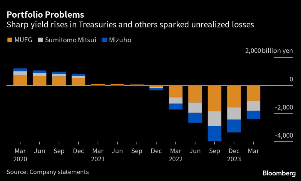 The nation’s three largest banks are sitting on paper losses of 2.4 trillion yen ($17.3 billion) on their foreign bond holdings as of March.