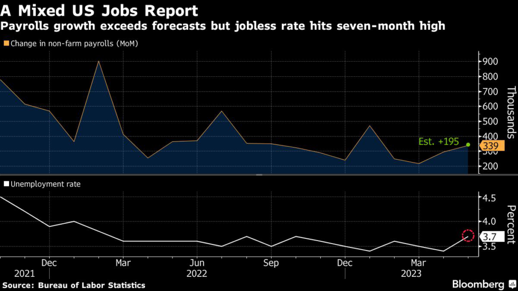 (Bloomberg) — The latest US jobs report presented conflicting signals on a heretofore robust labor market: hiring that exceeded expectations and a jump in the unemployment rate.